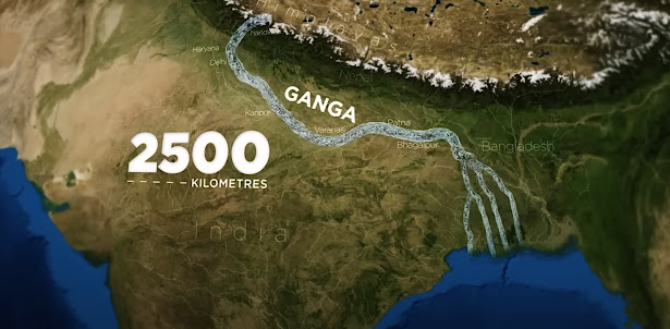 It is born at the snout of the Gangotri Glaciers nourished by snow and glacier meltwater draining from the Himalayan Mountains in northern India and travels more than 2,500 km (1,600 mi) before deb.
